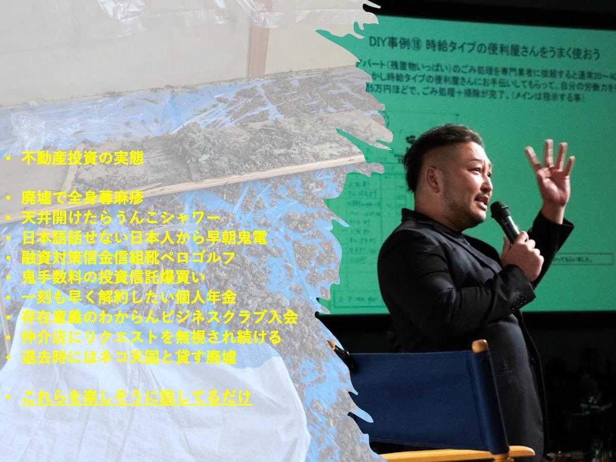 24歳で不動産投資に挑戦し、27%という高利回りを実現。41歳で17棟203戸まで資産を拡大。入居率50%以下の物件を安く買い、高い稼働率で運用、使われなくなった旅館や社員寮などをシェアハウスなどに改装して高収益物件へ再生